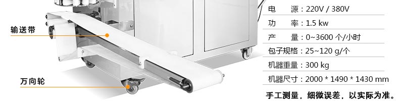 名稱(chēng)XZ-290II卷面式包子機(jī) 電源220/380V(見(jiàn)機(jī)器名牌) 功率1.8kw 產(chǎn)量0-3600個(gè)/小時(shí) 尺寸2680*1500*1420mm(包括輸送帶) 重量420kg 規(guī)格25-130克/個(gè) 其他