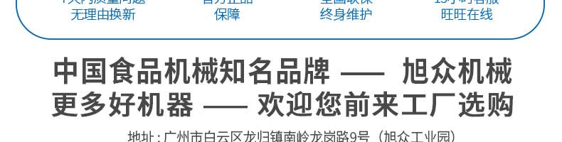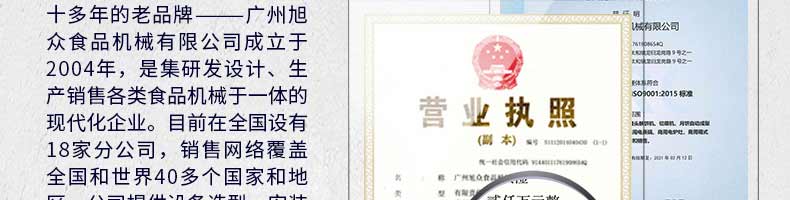 廣州旭眾食品機械有限公司是一家集科研開發(fā),生產(chǎn)設計,營銷服務為一體的現(xiàn)代化生產(chǎn)企業(yè)?,F(xiàn)代化生產(chǎn)車間,精湛制造技術(shù),所產(chǎn)機械歷經(jīng)市場重重考驗,不斷贏得海內(nèi)外客戶的贊譽。