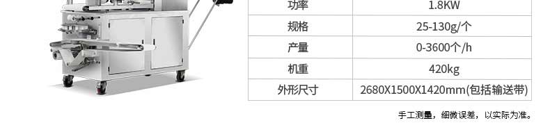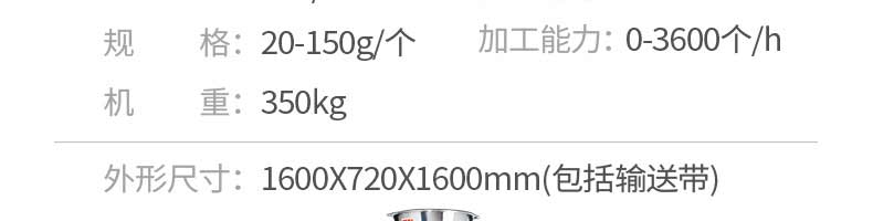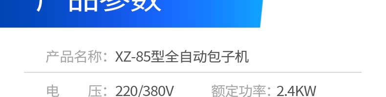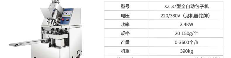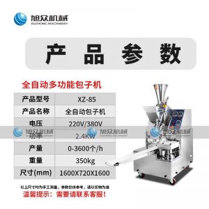 名稱XZ-85全自動包子機 電源220/380v 功率2.4kw 產(chǎn)量 尺寸1600*720*1600mm 重量350kg 規(guī)格20-150克/只 其他