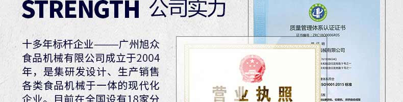 廣州旭眾食品機械有限公司是一家集科研開發(fā),生產(chǎn)設(shè)計,營銷服務(wù)為一體的現(xiàn)代化生產(chǎn)企業(yè)?,F(xiàn)代化生產(chǎn)車間,精湛制造技術(shù),所產(chǎn)機械歷經(jīng)市場重重考驗,不斷贏得海內(nèi)外客戶的贊譽。