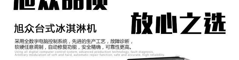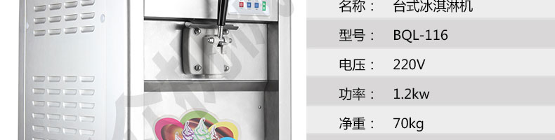 BQL-116臺式冰淇淋機,●選用國際名牌成熟制冷配套件和高效壓縮機,融合旭眾精湛工藝輔以嚴格的質(zhì)量控制流程,使產(chǎn)品整體性能及品質(zhì)得以全面提升?!癫捎萌珨?shù)字電腦控制系統(tǒng),選用名牌優(yōu)質(zhì)電器元件,先進的生產(chǎn)工藝,故障診斷,軟硬任意調(diào)制,自動修復功能,安全精確,可靠性更高。●專業(yè)成熟制冷系統(tǒng)設(shè)計,選用世界名牌大功率專用壓縮機,大大縮短冰淇淋成型時間,相同時間內(nèi)冰淇淋產(chǎn)量大幅度增加,使您生意火爆時依然得心應(yīng)手,為您創(chuàng)造財富?!癜踩椒€(wěn)的機械攪拌系統(tǒng),噪音更低、振動更小,使整機運行性能達到國際先進水平。●確保進料溫度在0°C~35°C;環(huán)境溫度5°C~40°C勻可正常使用。