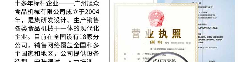 廣州旭眾食品機(jī)械有限公司是一家集科研開(kāi)發(fā),生產(chǎn)設(shè)計(jì),營(yíng)銷服務(wù)為一體的現(xiàn)代化生產(chǎn)企業(yè)?,F(xiàn)代化生產(chǎn)車間,精湛制造技術(shù),所產(chǎn)機(jī)械歷經(jīng)市場(chǎng)重重考驗(yàn),不斷贏得海內(nèi)外客戶的贊譽(yù)。