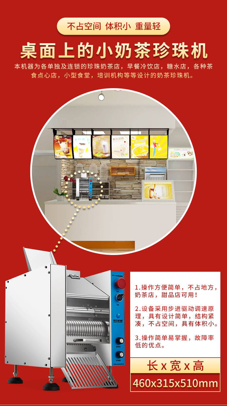 VFD-900珍珠奶茶機,奶茶店、甜品店可用。可生產(chǎn)奶茶珍珠,果蔬圓子,無餡湯圓,水晶湯圓,各種芋圓。不占空間、體積小、重量輕,桌面上的小奶茶珍珠機。告別手工繁瑣的工序,省時省力,輕松解決手工麻煩,成本高等一系列問題