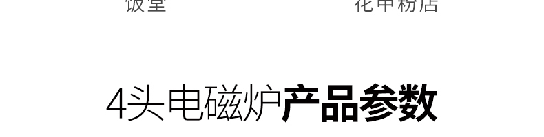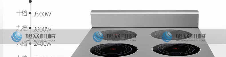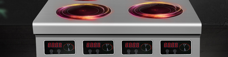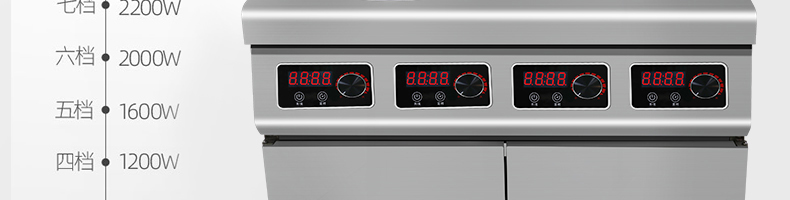 名稱四頭柜式電磁爐 電源220V 功率3.5KW×4 產(chǎn)量聯(lián)系銷售員 尺寸800×800×800+120M 重量聯(lián)系銷售員 規(guī)格頭數(shù):4頭 其他