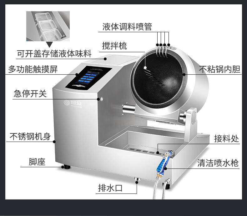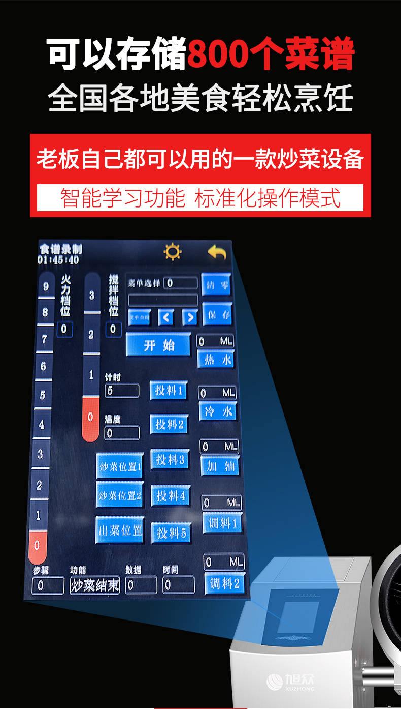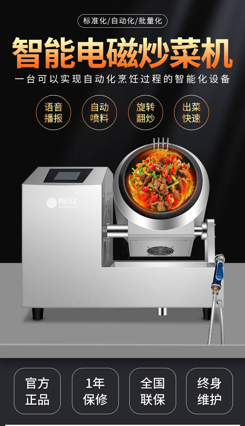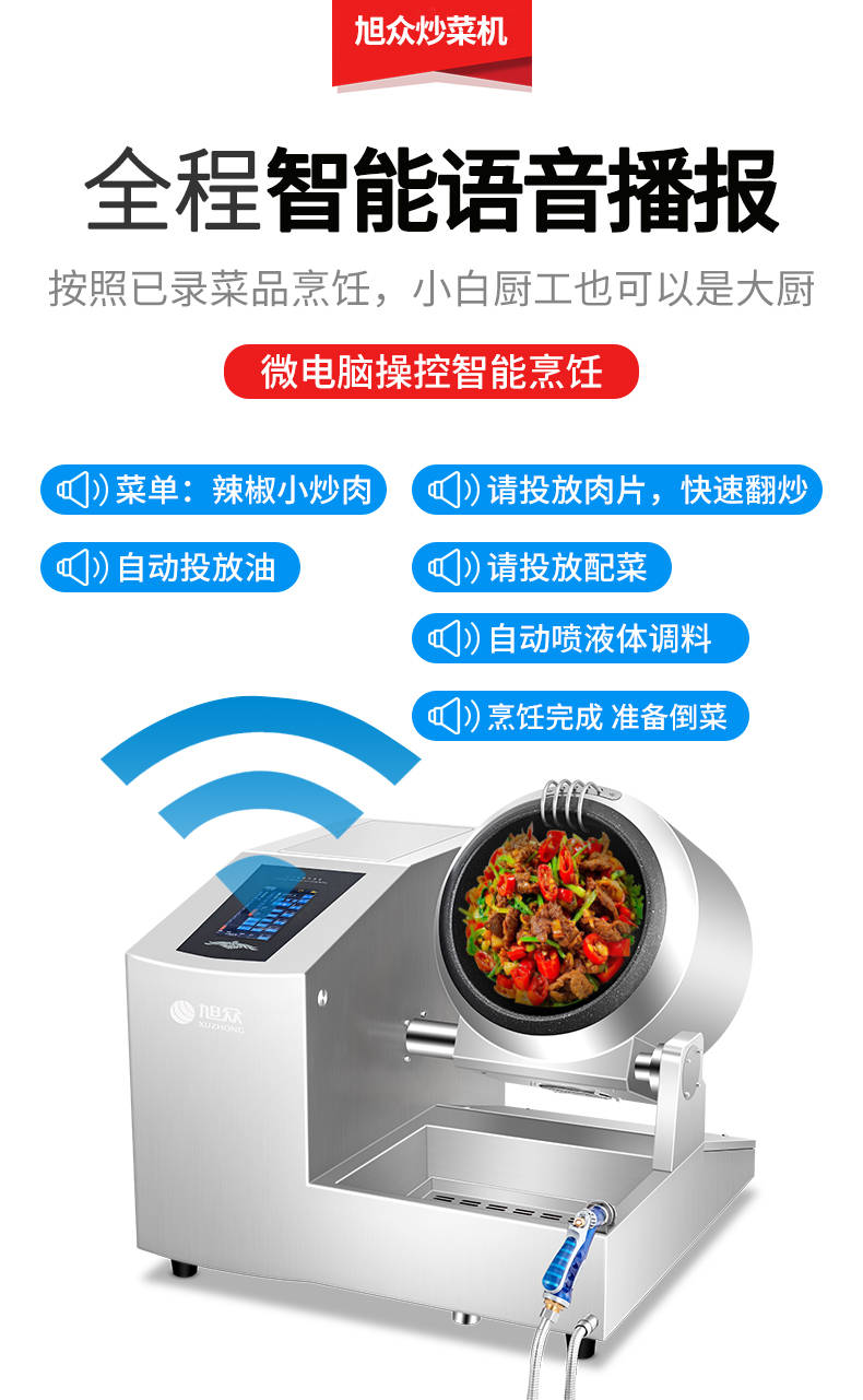 XZ-30TCP臺式300智能電磁炒菜機(觸屏+噴料),可以實現自動化烹飪過程的智能化設備,語音播報、自動噴料、旋轉翻炒、快速出菜。實現自動化烹飪,新一代微電腦操控智能烹飪設備、顛覆傳統炒菜模式。5000W猛火爆炒美食更鮮香