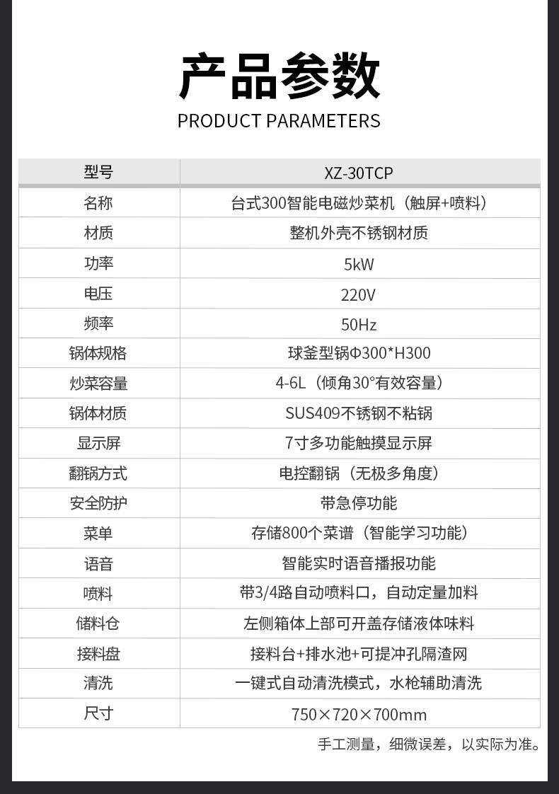 名稱XZ-30TCP臺式300智能電磁炒菜機(觸屏+噴料) 電源220V 功率5KW 產量請咨詢銷售員 尺寸750×720×700mm 重量請咨詢銷售員 規(guī)格請咨詢銷售員 其他材質:整機外殼不銹鋼材質