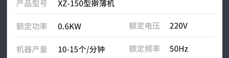 XZ-150型搟薄機(jī),為一種對(duì)面團(tuán)可進(jìn)行氣動(dòng)拍餅或仿手工搟薄的設(shè)備,可根據(jù)用戶需要對(duì)面團(tuán)的直徑、厚度進(jìn)行調(diào)整并將面團(tuán)按照設(shè)定的規(guī)格進(jìn)行搓圓摔搟薄。