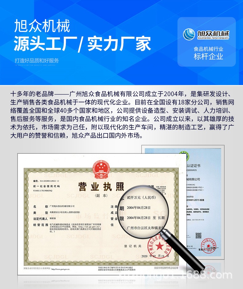 廣州旭眾食品機(jī)械有限公司是一家集科研開(kāi)發(fā),生產(chǎn)設(shè)計(jì),營(yíng)銷服務(wù)為一體的現(xiàn)代化生產(chǎn)企業(yè)?,F(xiàn)代化生產(chǎn)車間,精湛制造技術(shù),所產(chǎn)機(jī)械歷經(jīng)市場(chǎng)重重考驗(yàn),不斷贏得海內(nèi)外客戶的贊譽(yù)。