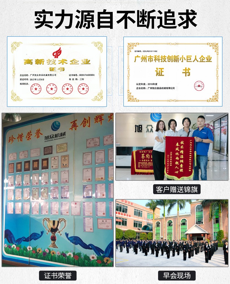 廣州旭眾食品機(jī)械有限公司是一家集科研開發(fā),生產(chǎn)設(shè)計(jì),營銷服務(wù)為一體的現(xiàn)代化生產(chǎn)企業(yè)?,F(xiàn)代化生產(chǎn)車間,精湛制造技術(shù),所產(chǎn)機(jī)械歷經(jīng)市場重重考驗(yàn),不斷贏得海內(nèi)外客戶的贊譽(yù)。