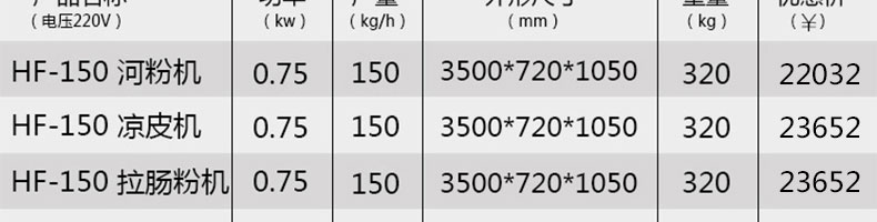 名稱SZ-HF-150涼皮機 電源220/380V 功率0.75/41kw 產(chǎn)量60/90/120/150kg/h 尺寸主機尺寸3500*720*1050mm 外形尺寸3600*920*1500mm 重量320kg 規(guī)格粉條寬度mm:4/6/8/10 其他