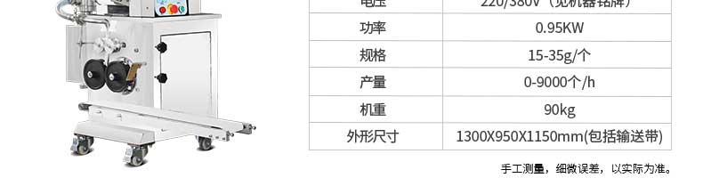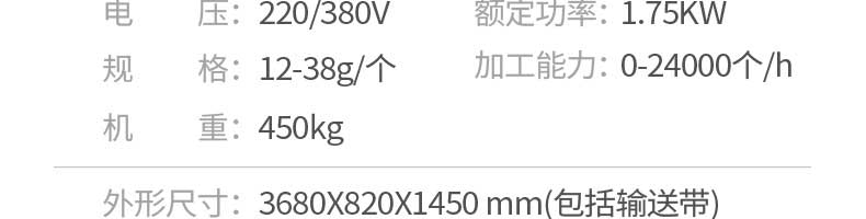 名稱JGB-360仿手工餃子機 電源220/380v 功率1.75kw 產(chǎn)量0-24000個/h 尺寸3680*820*1450mm 重量450kg 規(guī)格12-38g/個 其他