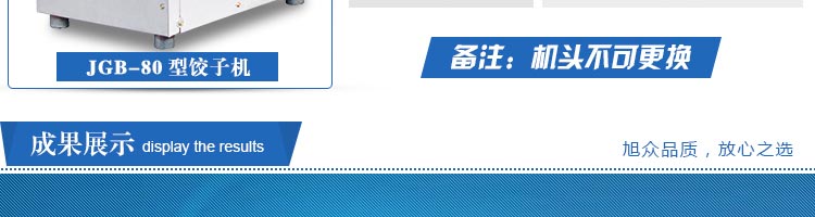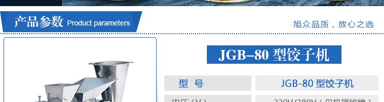 JGB-80型號餃子機,本機是一款可生產(chǎn)各種肉餡、肉菜混合餡、全菜餡及其他種餡餃子的設(shè)備。包制出來的餃子可蒸、煮、炸、煎等多種調(diào)理。適用于賓館、飯店、餐廳、團體食堂加工,幼兒園、速凍餃子生產(chǎn)。