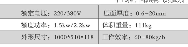 名稱60豪花型壓面面條機(jī) 電源220/380v 功率1.5kw-2.2kw 產(chǎn)量60-80kg/h 尺寸1000*510*118mm 重量111kg 規(guī)格 其他