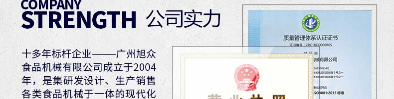 廣州旭眾食品機(jī)械有限公司是一家集科研開發(fā),生產(chǎn)設(shè)計,營銷服務(wù)為一體的現(xiàn)代化生產(chǎn)企業(yè)。現(xiàn)代化生產(chǎn)車間,精湛制造技術(shù),所產(chǎn)機(jī)械歷經(jīng)市場重重考驗,不斷贏得海內(nèi)外客戶的贊譽(yù)。