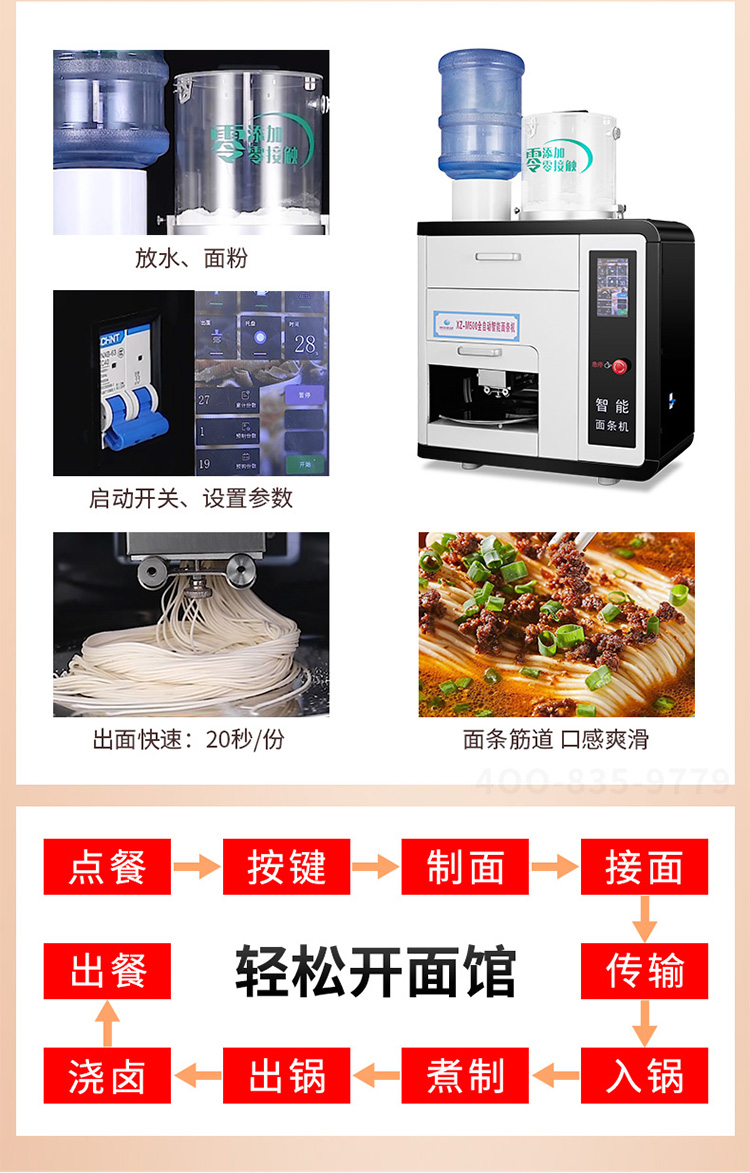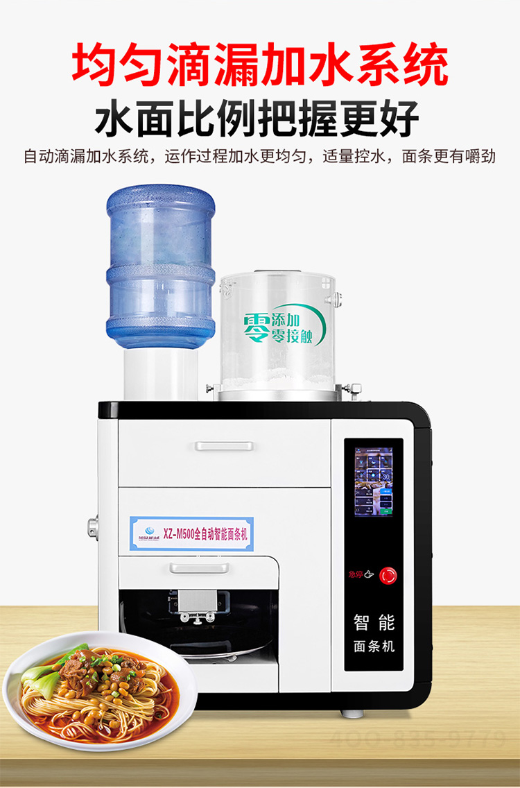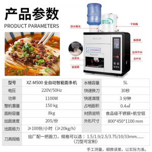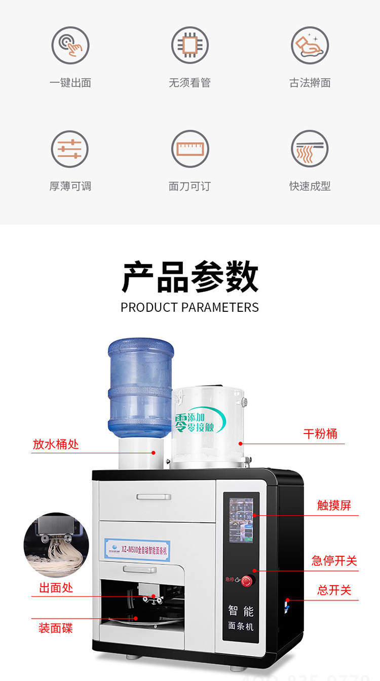 全自動(dòng)商用快速出面電動(dòng)素面濕面M500臺(tái)式制面機(jī)器,20秒全自動(dòng)出面,全程無需看管。一鍵出面,面做好,自動(dòng)停。均勻滴漏加水系統(tǒng),水面比例把握更好。自動(dòng)滴漏加水系統(tǒng),運(yùn)作過程加水更均勻,適量控水,面條更有嚼勁。