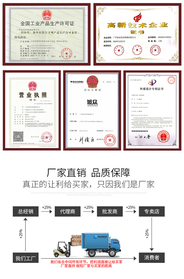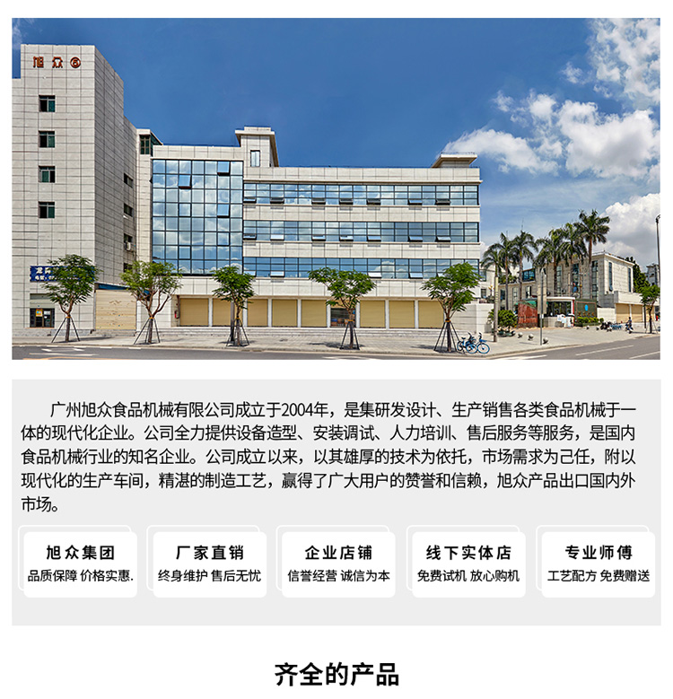 廣州旭眾食品機(jī)械有限公司是一家集科研開發(fā),生產(chǎn)設(shè)計(jì),營(yíng)銷服務(wù)為一體的現(xiàn)代化生產(chǎn)企業(yè)?,F(xiàn)代化生產(chǎn)車間,精湛制造技術(shù),所產(chǎn)機(jī)械歷經(jīng)市場(chǎng)重重考驗(yàn),不斷贏得海內(nèi)外客戶的贊譽(yù)。