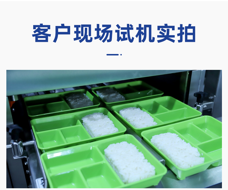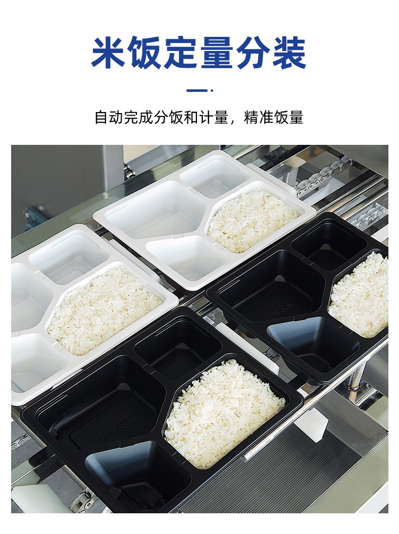 米飯分裝機(jī),適用多場(chǎng)合大型米飯加工中心、快餐公司、大型配餐中心企事業(yè)單位、學(xué)校食堂、釀造企業(yè)。米飯定量分裝,自動(dòng)完成分飯和計(jì)量,精準(zhǔn)飯量。米飯先扒松再分盒,能將米飯扒松分盒,使米飯更加松軟可口。