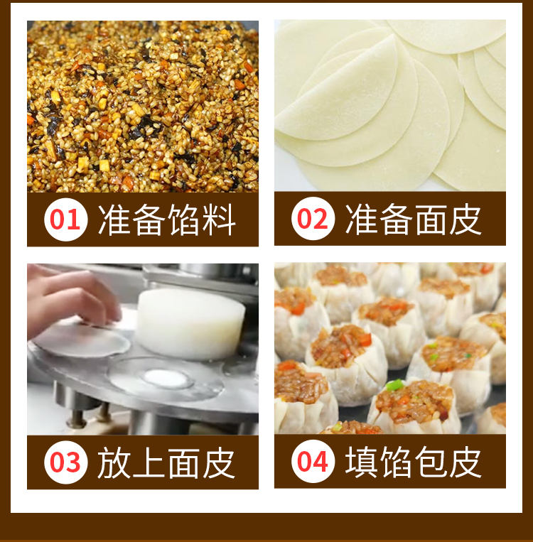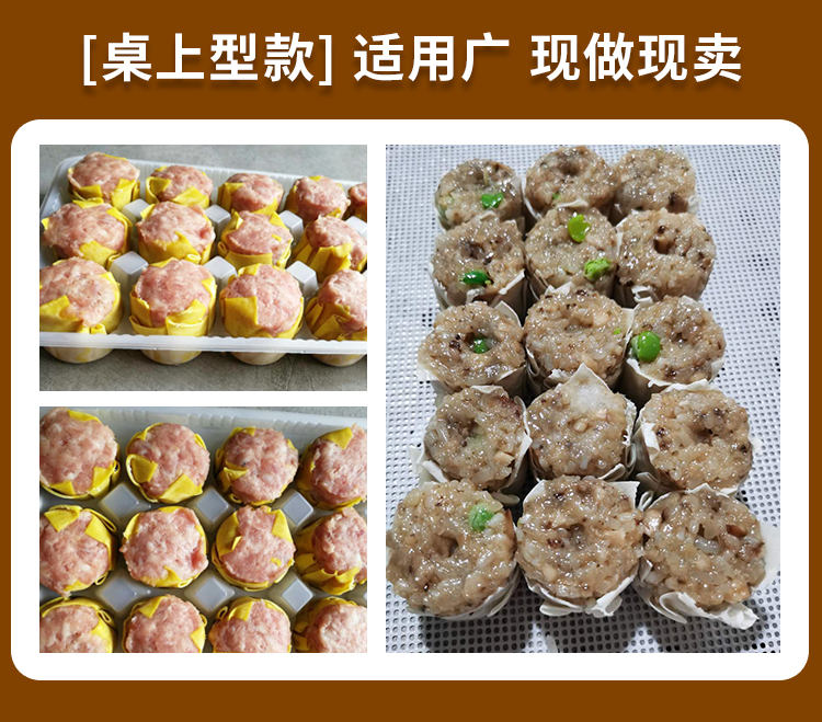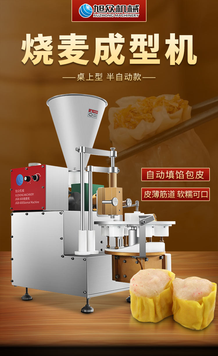 JGB-600燒麥機(jī),自動(dòng)填餡包皮功能:臺(tái)式半自動(dòng)單聯(lián)式燒麥成型機(jī),可以使用手工燒麥皮配合機(jī)器生產(chǎn)燒賣,其面皮口感好,產(chǎn)品外形美觀。餡料多與少可調(diào)節(jié)高效率1800個(gè)小時(shí)