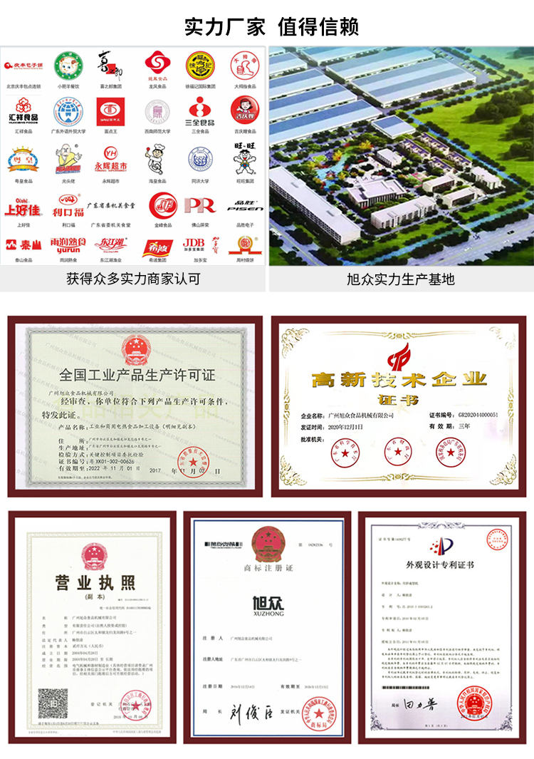 廣州旭眾食品機(jī)械有限公司是一家集科研開發(fā),生產(chǎn)設(shè)計(jì),營銷服務(wù)為一體的現(xiàn)代化生產(chǎn)企業(yè)?,F(xiàn)代化生產(chǎn)車間,精湛制造技術(shù),所產(chǎn)機(jī)械歷經(jīng)市場(chǎng)重重考驗(yàn),不斷贏得海內(nèi)外客戶的贊譽(yù)。
