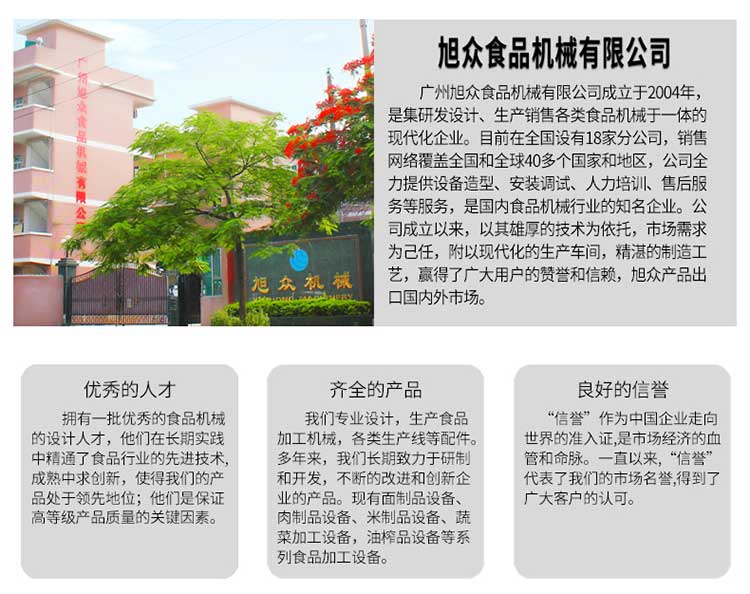 廣州旭眾食品機(jī)械有限公司是一家集科研開(kāi)發(fā),生產(chǎn)設(shè)計(jì),營(yíng)銷服務(wù)為一體的現(xiàn)代化生產(chǎn)企業(yè)?,F(xiàn)代化生產(chǎn)車間,精湛制造技術(shù),所產(chǎn)機(jī)械歷經(jīng)市場(chǎng)重重考驗(yàn),不斷贏得海內(nèi)外客戶的贊譽(yù)。