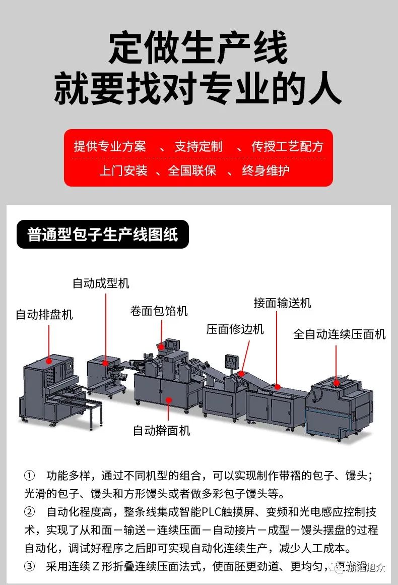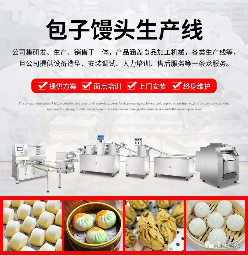 智能包子饅頭生產(chǎn)線,功能多樣,通過不同機(jī)型的組合,可以實現(xiàn)制作帶褶的包子、饅頭;光滑的包子、饅頭和方形饅頭或者做多彩包子饅頭等。