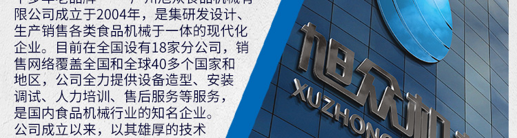 廣州旭眾食品機械有限公司是一家集科研開發(fā),生產設計,營銷服務為一體的現(xiàn)代化生產企業(yè)?,F(xiàn)代化生產車間,精湛制造技術,所產機械歷經市場重重考驗,不斷贏得海內外客戶的贊譽。