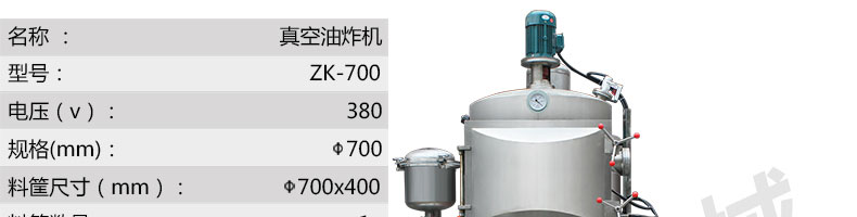 名稱(chēng)zk-700雙室低溫真空油炸機(jī) 電源380V 功率11+3kw 產(chǎn)量15-60kg/次 尺寸1600*1600*2700mm 重量 規(guī)格料框數(shù)量1組;加熱方式:導(dǎo)熱油 其他