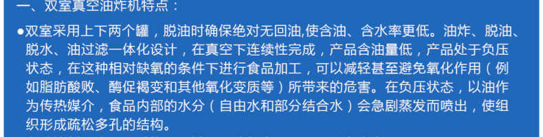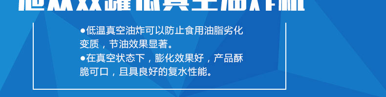 zk-700雙室低溫真空油炸機(jī),適用于水果類(lèi)、蔬菜類(lèi)、干果類(lèi)、水產(chǎn)品機(jī)畜禽肉類(lèi)等。自動(dòng)控制溫度,無(wú)過(guò)熱、無(wú)過(guò)壓,確保產(chǎn)品質(zhì)量和安全生產(chǎn)。