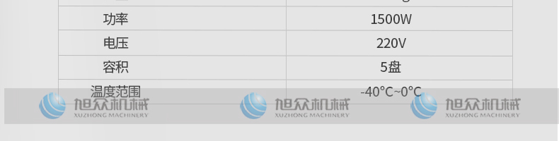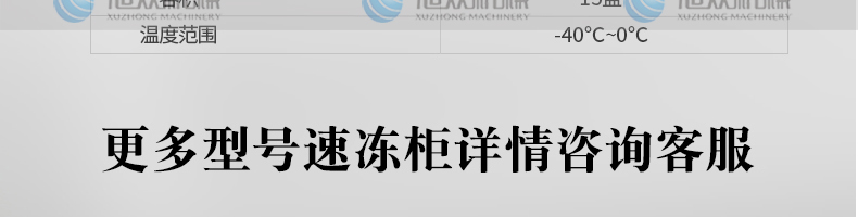 名稱XZ-E10速凍柜 電源220V 功率3300W 產(chǎn)量容積10盤 尺寸810*810*1600mm 重量130kg 規(guī)格溫度范圍-40°C~0°C 其他